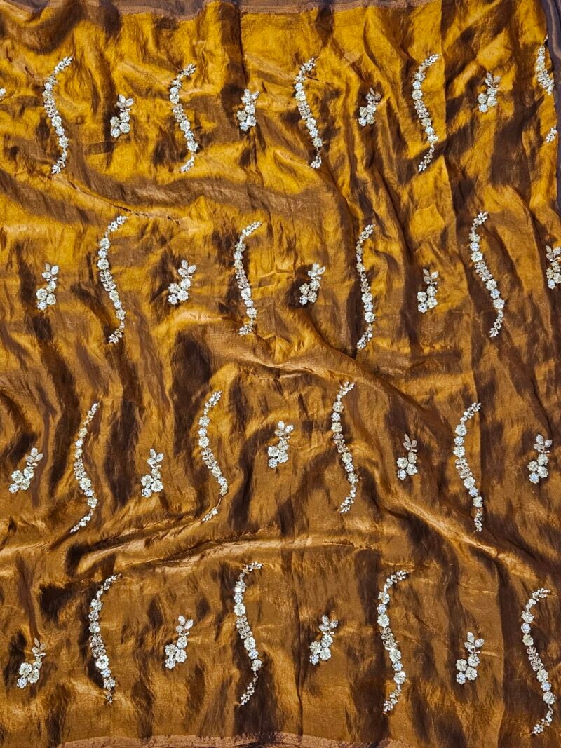 Beige Daman Beads Embroidery On Pure Shimmer Fabric