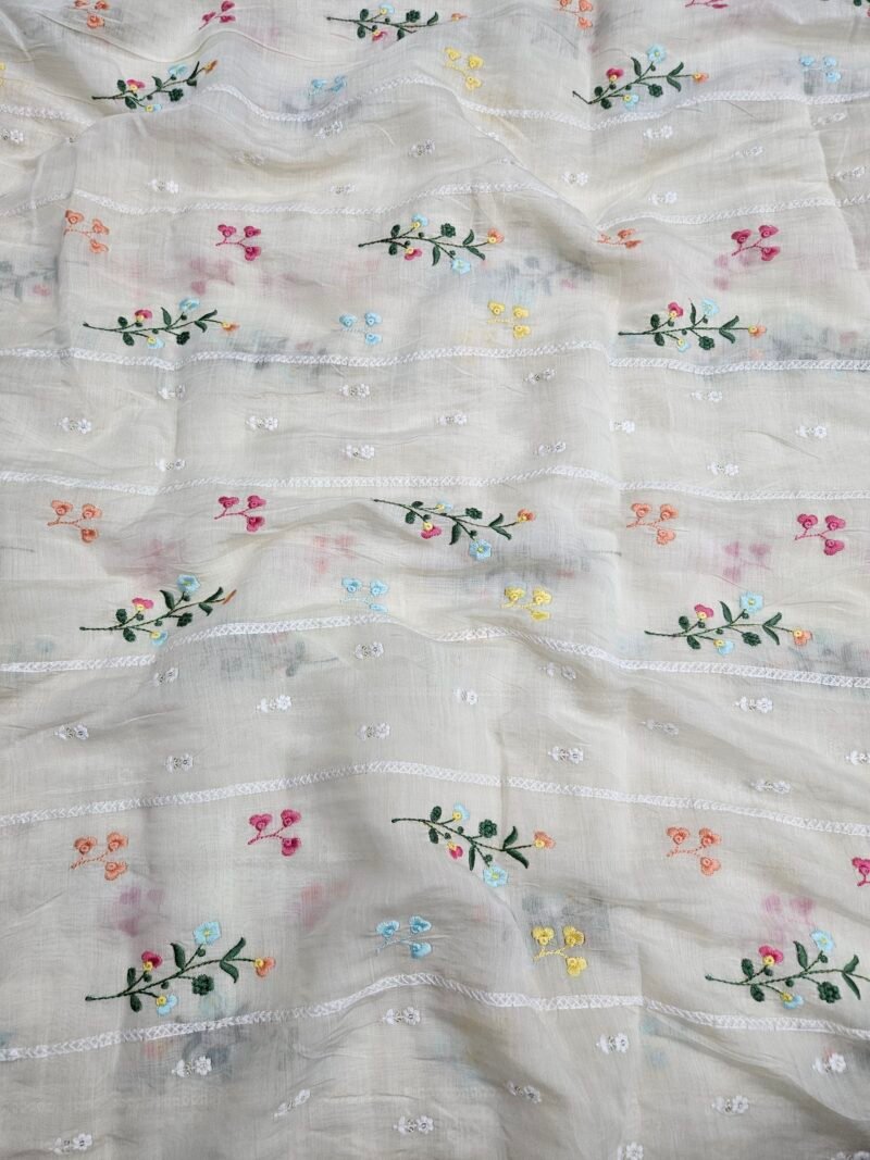 Cream Thread Embroidery On Mul Chanderi Fabric