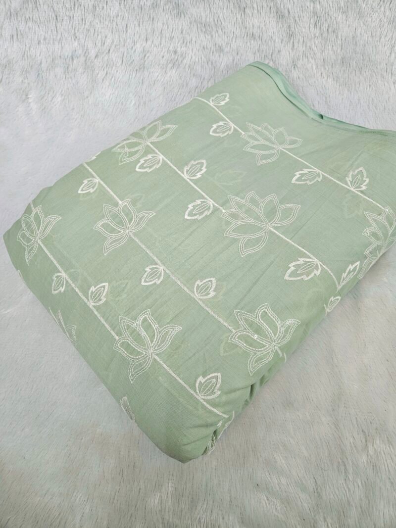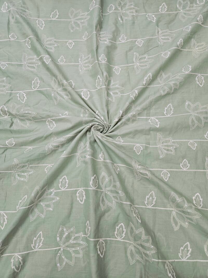 Green White Thread & Sequins Embroidery On Pure Cambric Cotton