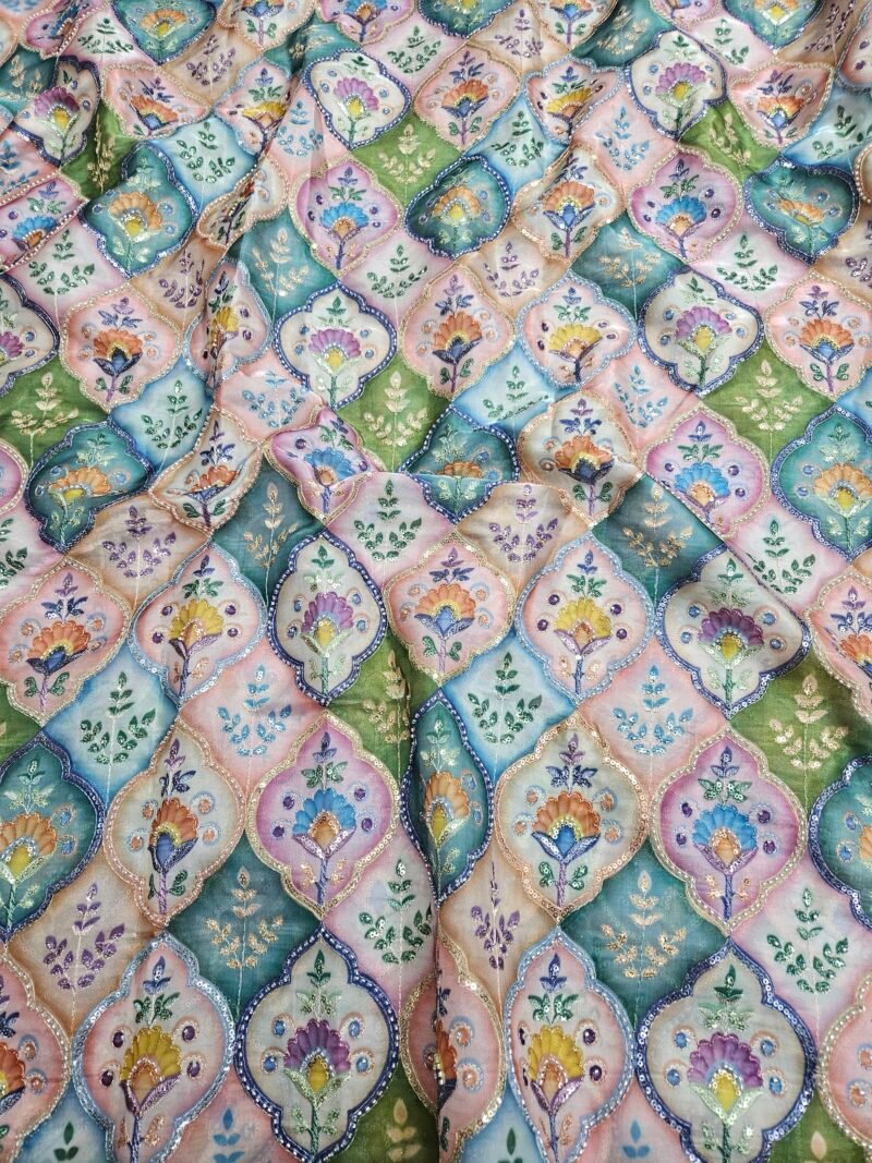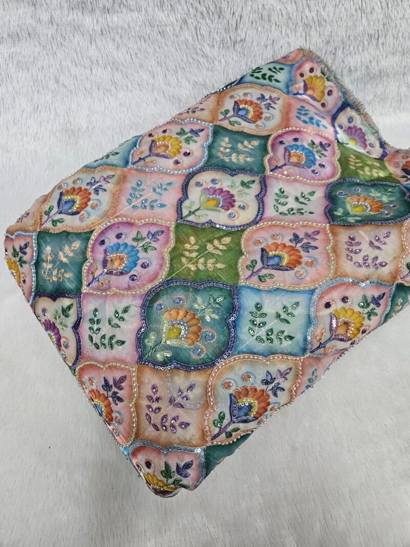 MULTI COLOUR POSITION PRINT WITH CUT DANA BEADS WORK ON JIMMY CHOO FABRIC