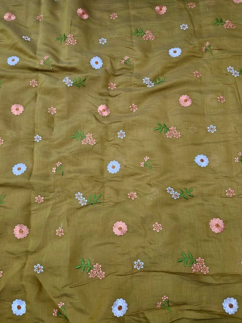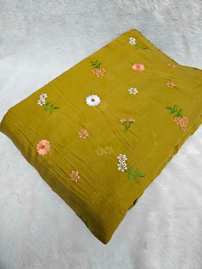 Mustard Multi-Color Thread Embroidery On Mul Chanderi Fabric